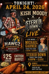 Live music hits Hawgz Smokehouse Pavilion in Scott, AR tonight with Kish Moody, Stereo Down, and Michael Garner. $25 cover includes a catfish buffet, cold drinks, and a full night of high-energy performances.