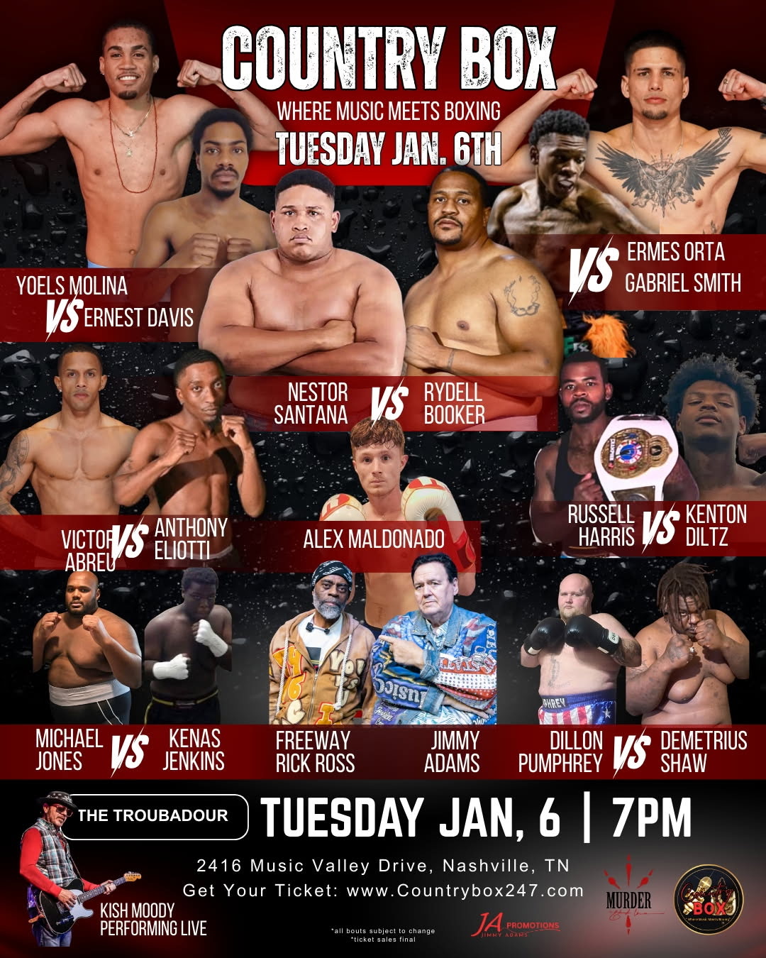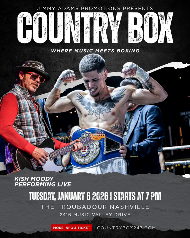 Nashville, get ready for a night unlike any other! Country Box Live, presented by Jimmy Adams Promotions, is coming to town, bringing together live country music and thrilling fight action for an unforgettable experience. Fans of music and sport alike will be on the edge of their seats as the energy builds from start to finish.